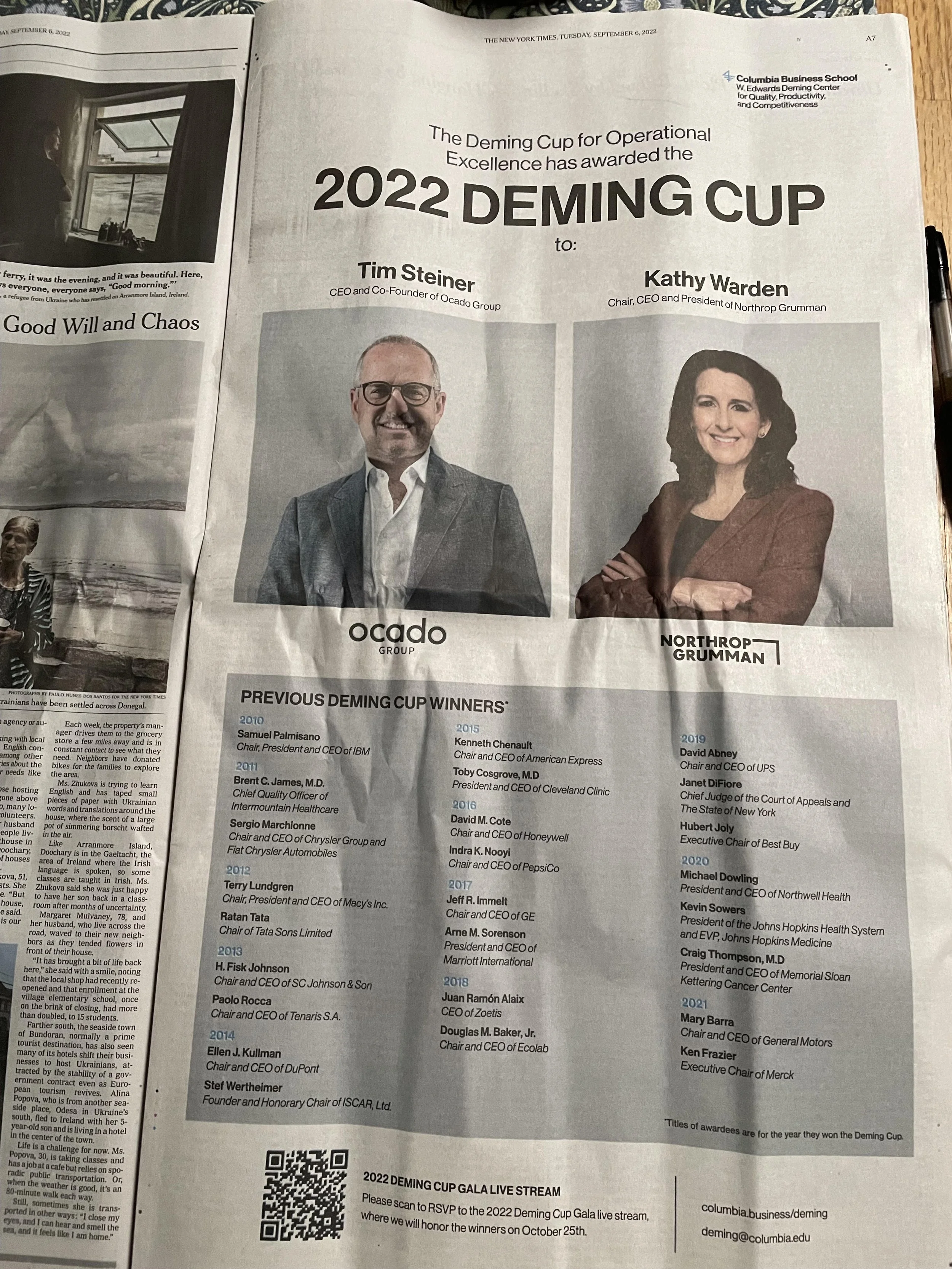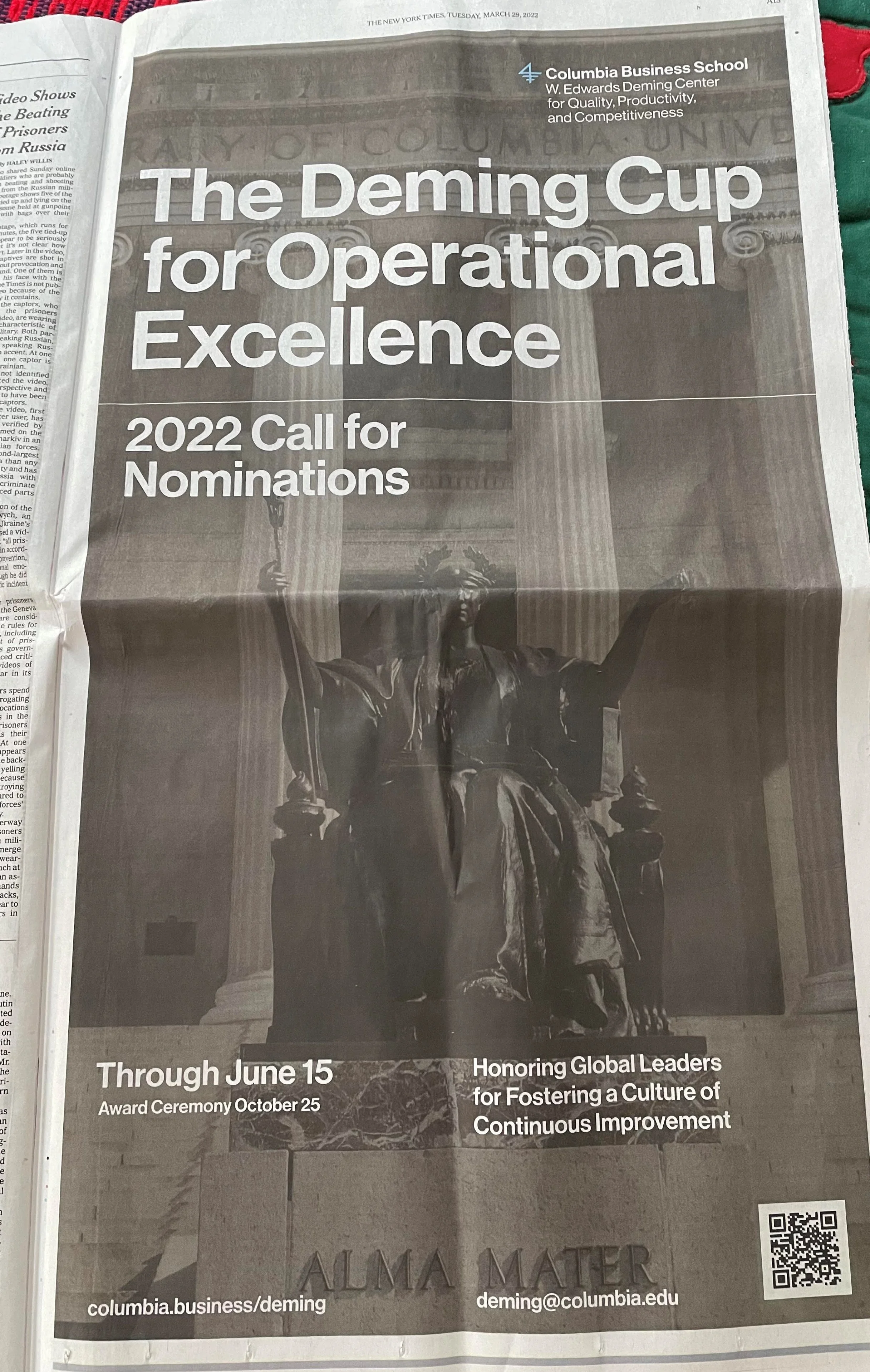 On March 29, 2022, we ran a full-page advertisement with The New York Times announcing the Call for Nominations for candidates for the 2022 Deming Cup. Once this article was published, I began gathering the nominations, working with nominee's communications teams to fill out the nomination forms, actively fundraising, putting together extensive dossiers for each candidate (10 pages per candidate), organizing and leading calls with three references per nominee, and organizing the judging committee call. The judging committee call comprises the past winners and notable leaders affiliated with Columbia Business School.