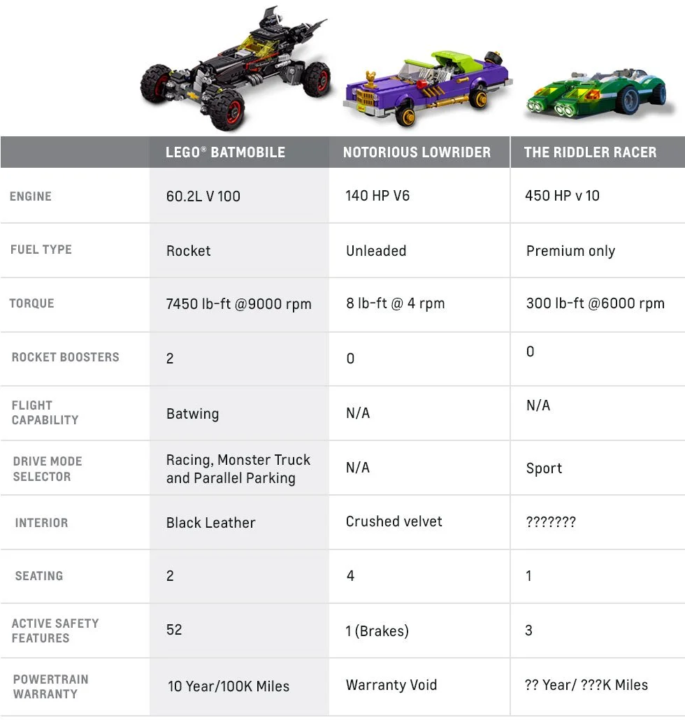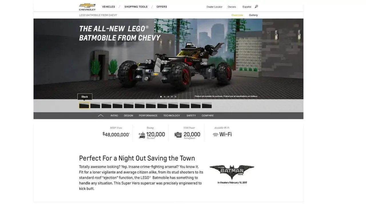 Since we created a life-size Lego Batmobile, it only seemed reasonable to treat it like any other vehicle launch and include it on the Chevrolet webpage. This produced a 65% lift in mobile traffic to the Chevrolet website and generated a lot of cheerful social brand chatter.